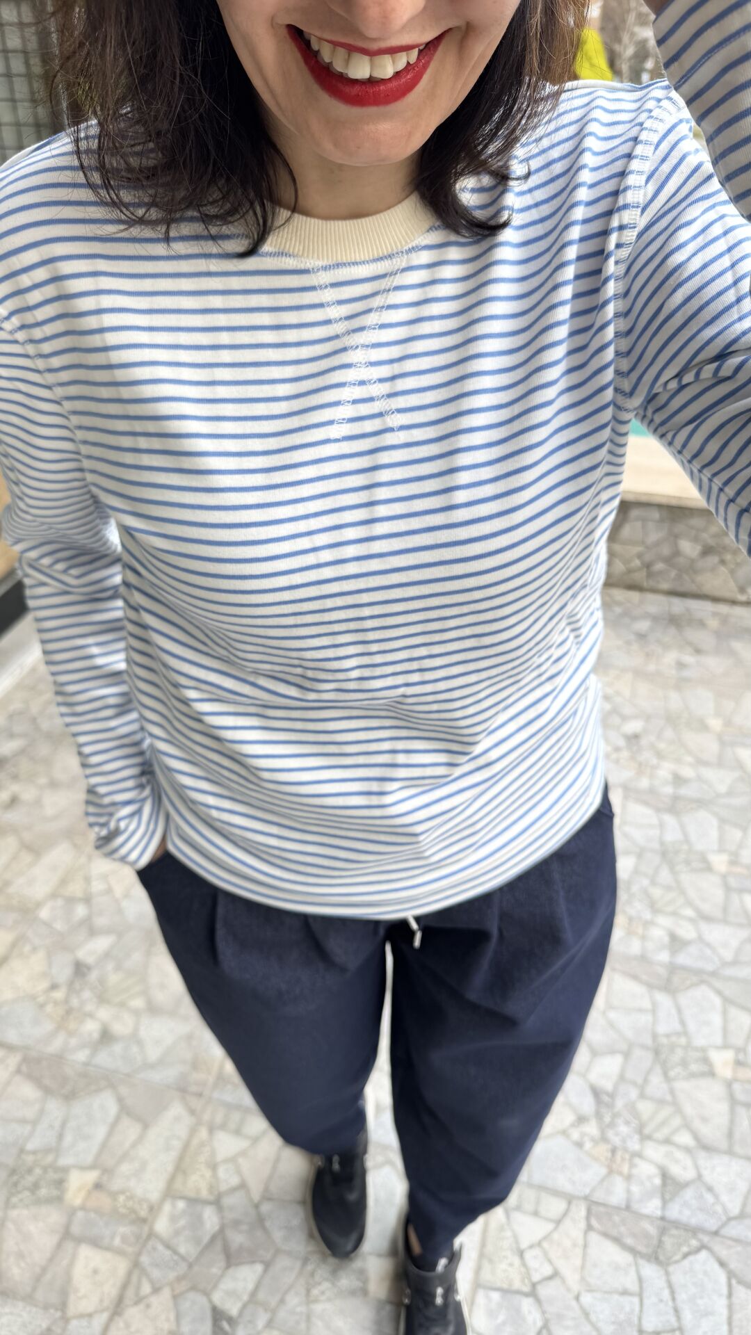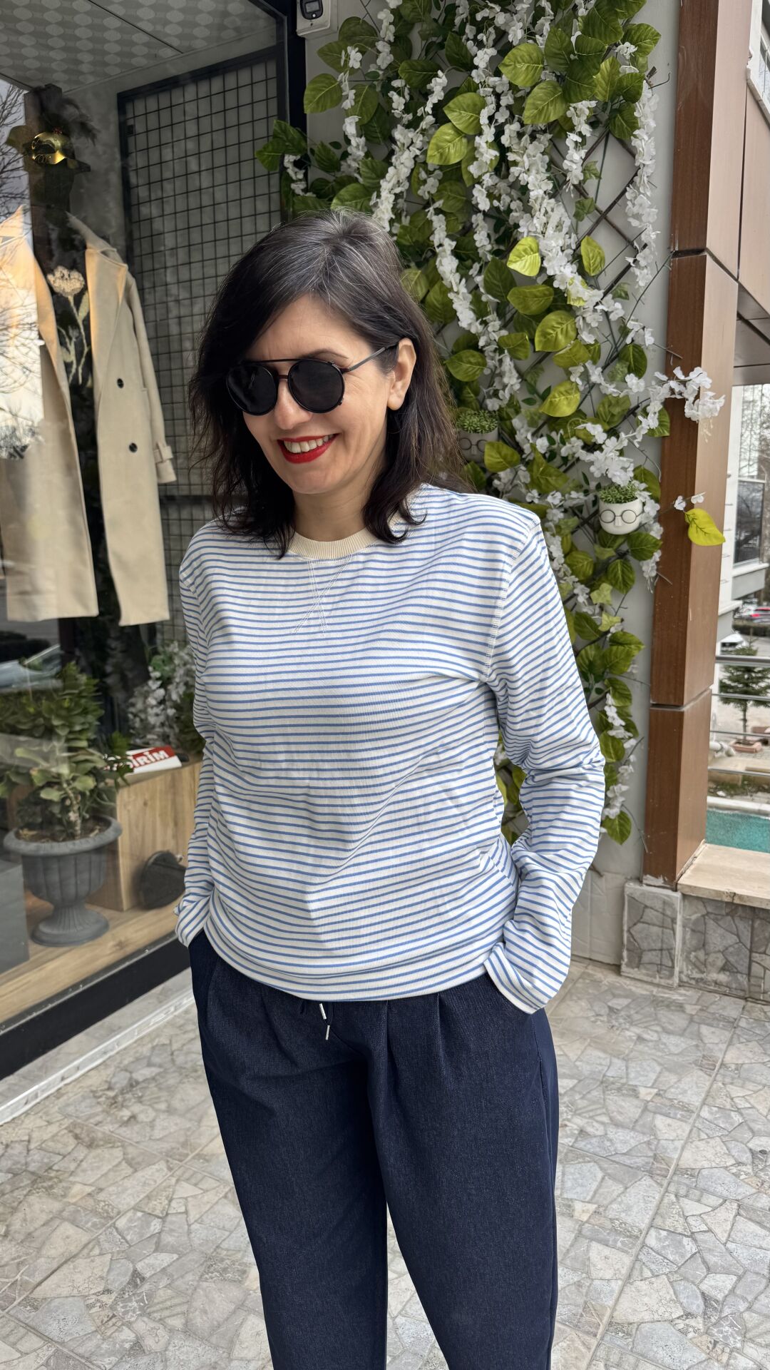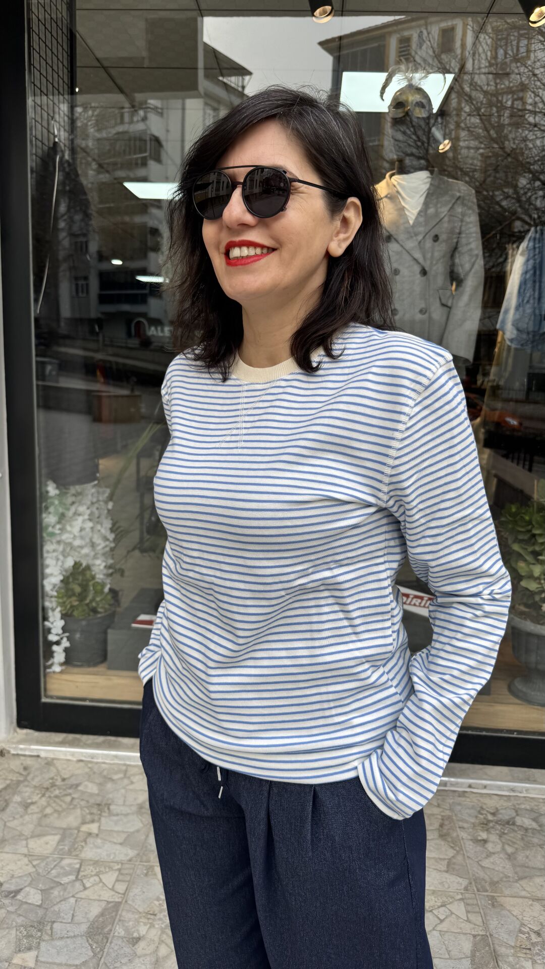 Açık Mavi Beyaz Çizgili Basic Rahat Kalıp Bisiklet Yaka Body