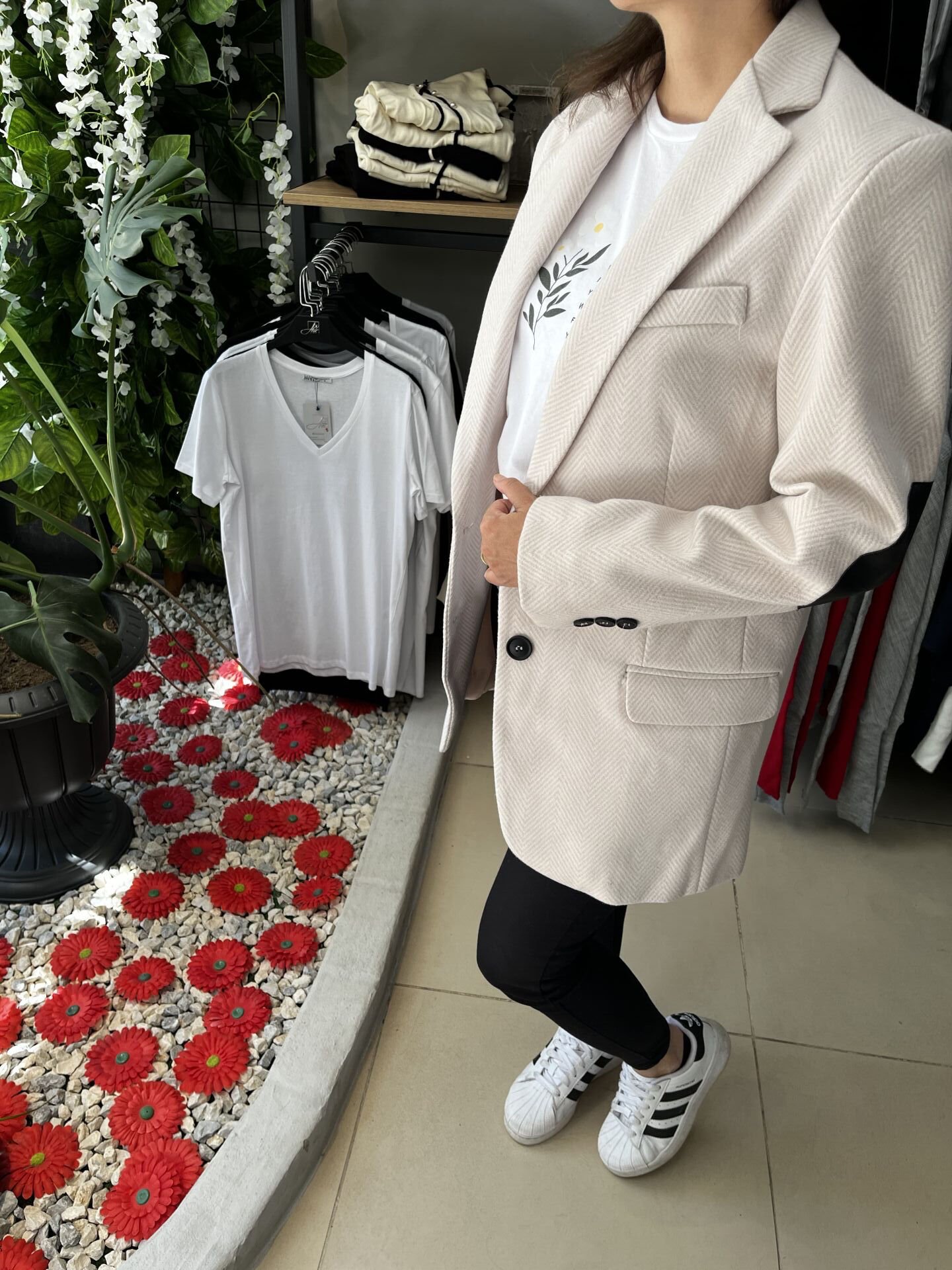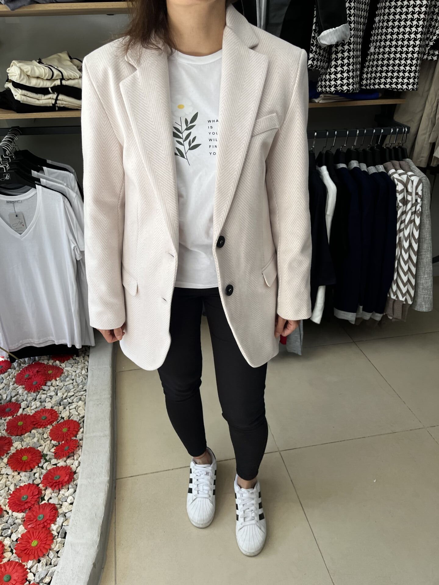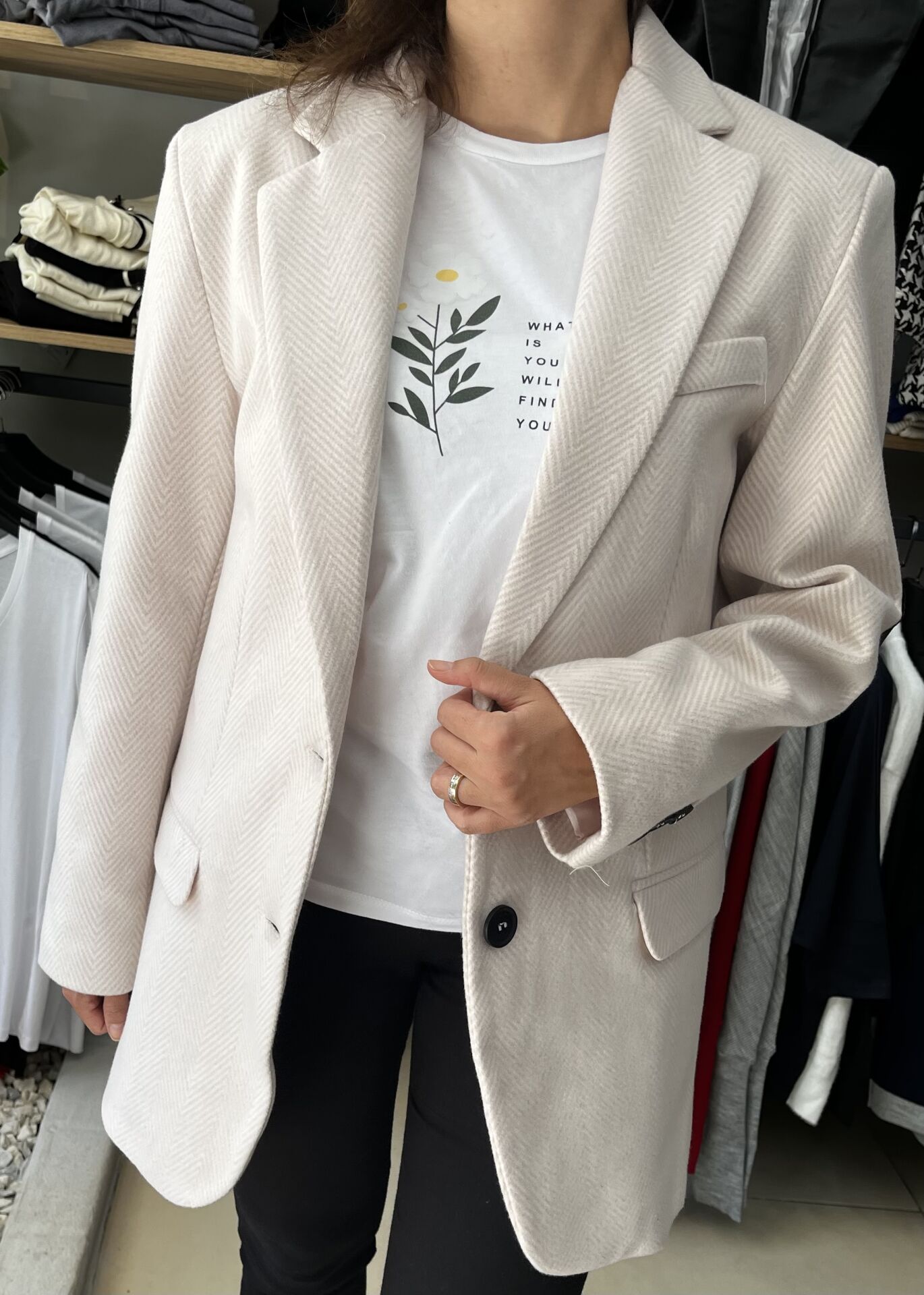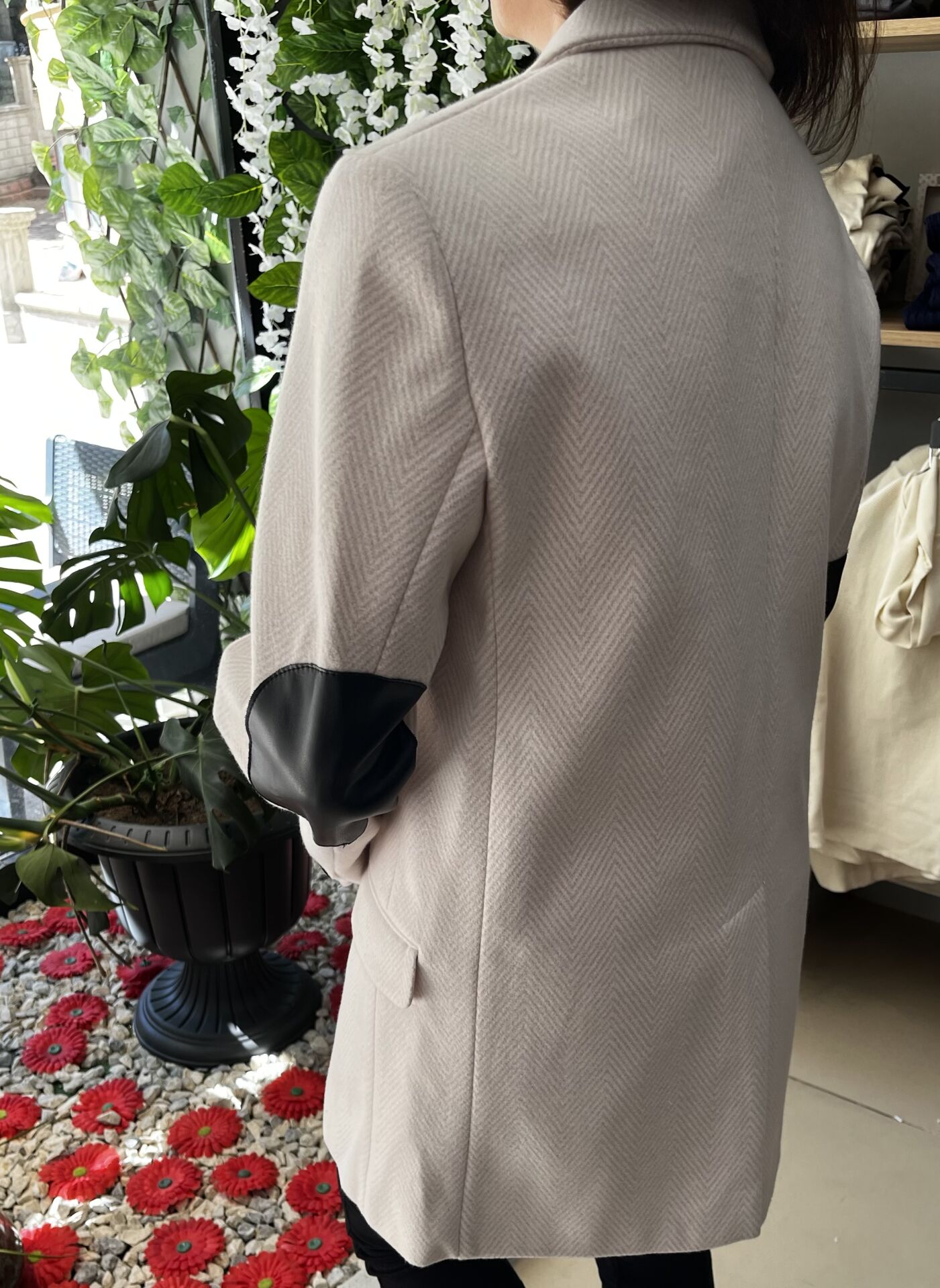 Ekru Kolu Deri Detaylı Balıksırtı Desenli Oversize Blazer Ceket