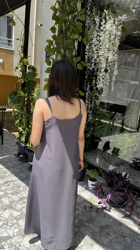 Gri İnce Askılı Uzun Dubai Kumaş Elbise
