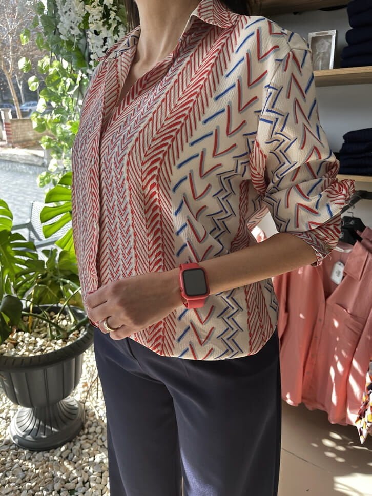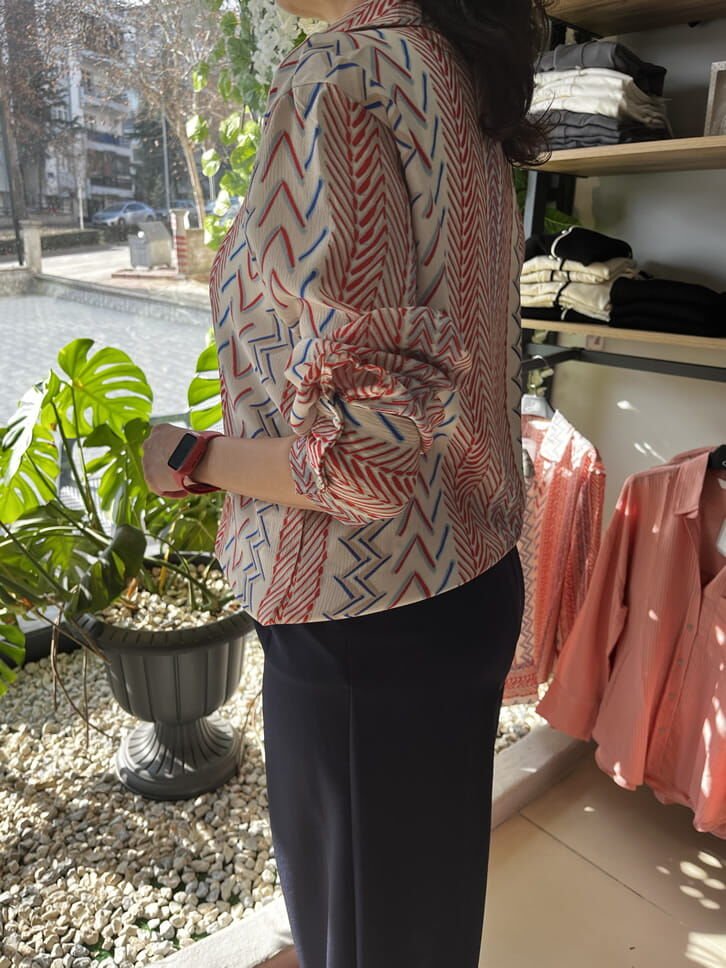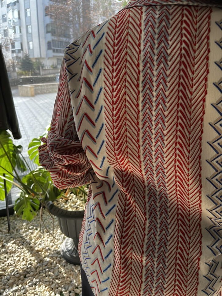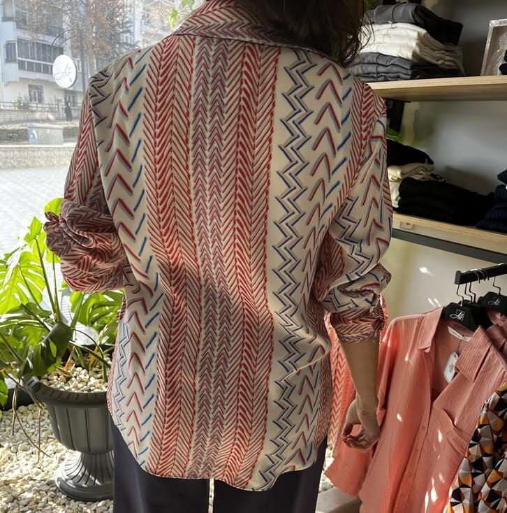 İpek Saten Kırmızı Lacivert Beyaz Desenli Gömlek