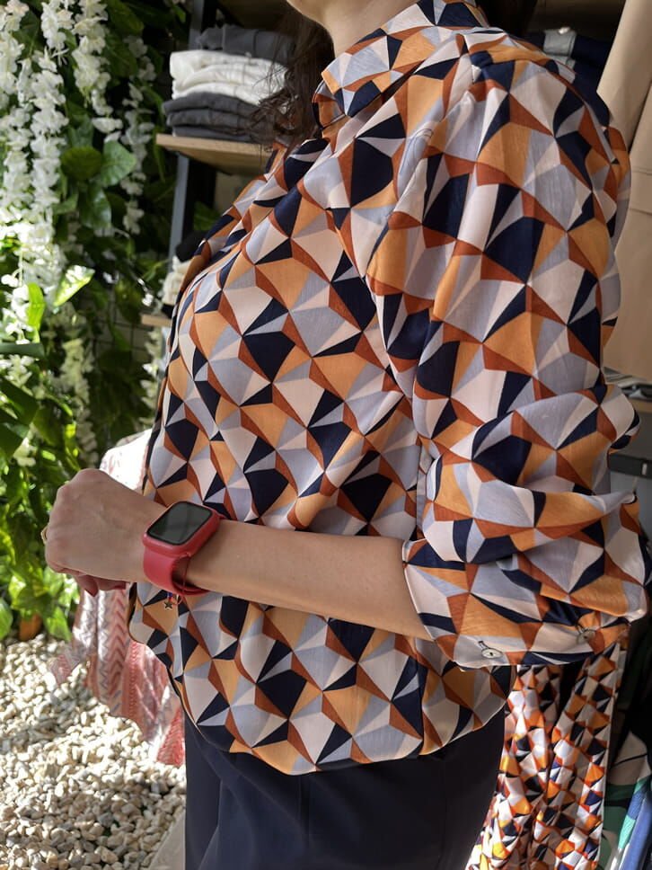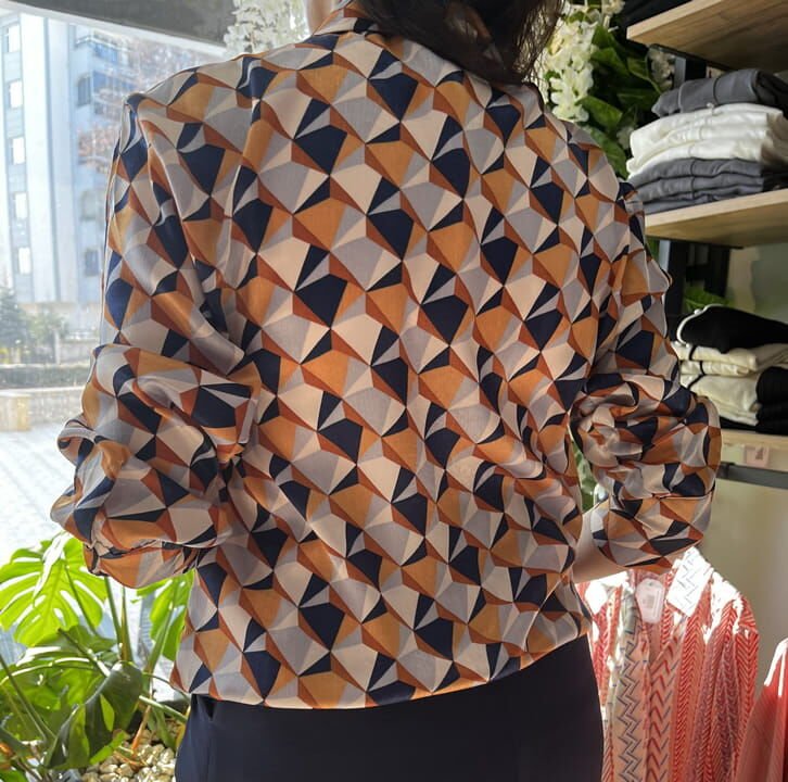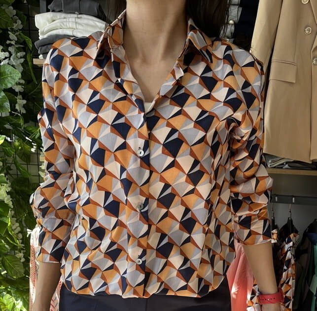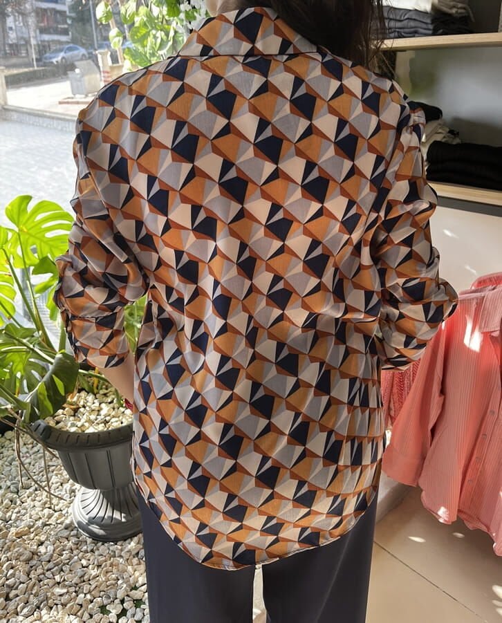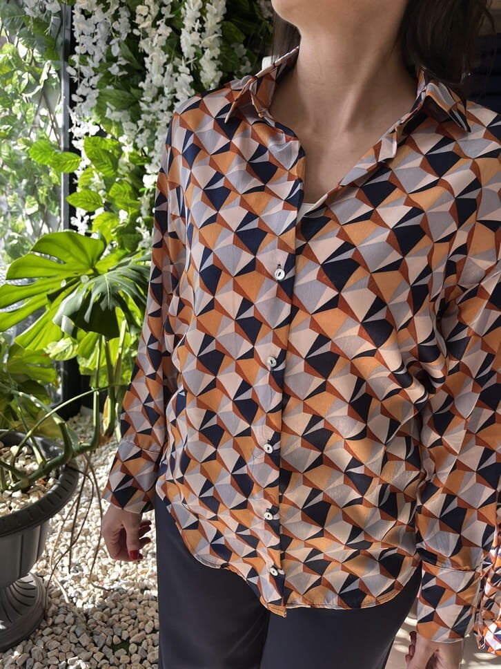 İpek Saten Turuncu Lacivert Desenli Gömlek
