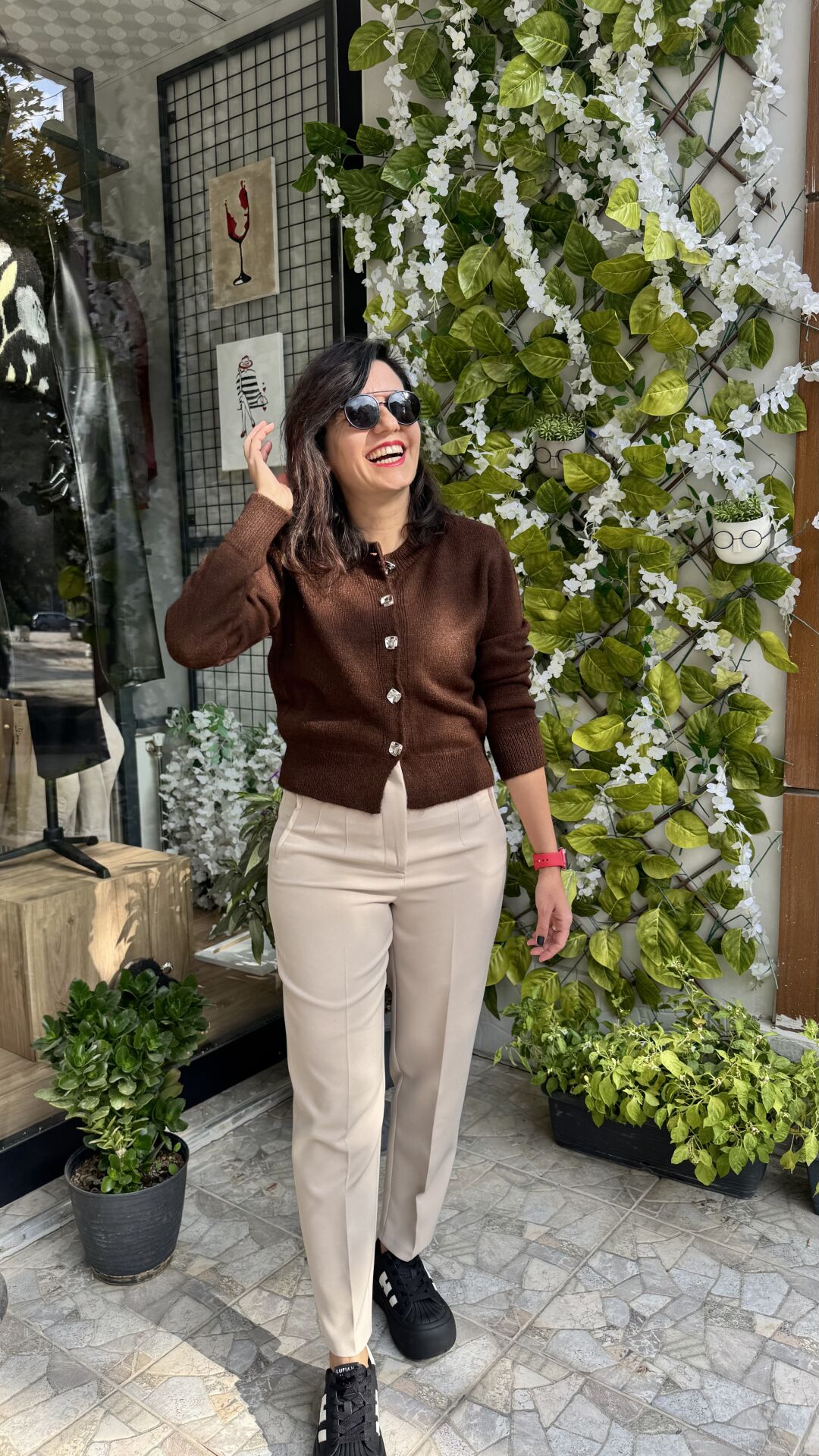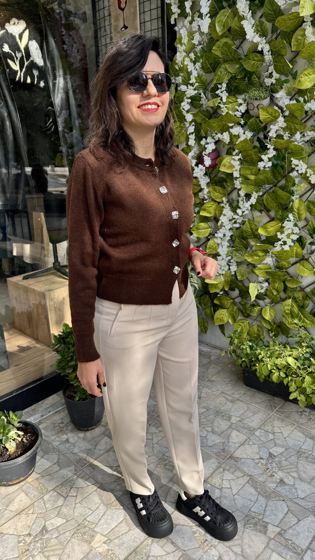 Kahverengi Yumuşak Bisiklet Yaka Kısa Parlak Düğme Detaylı Hırka