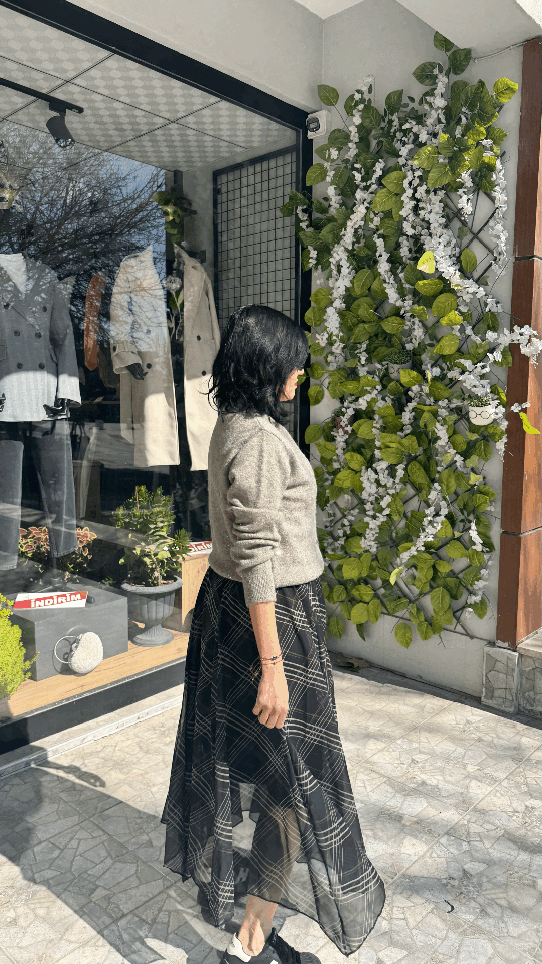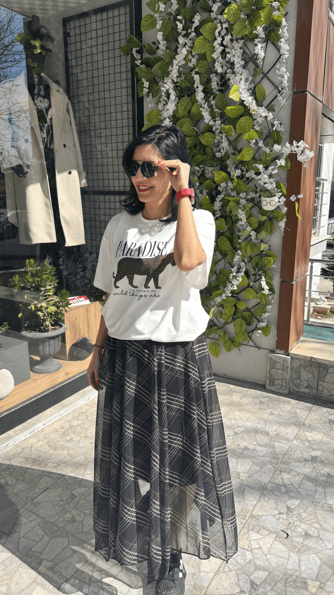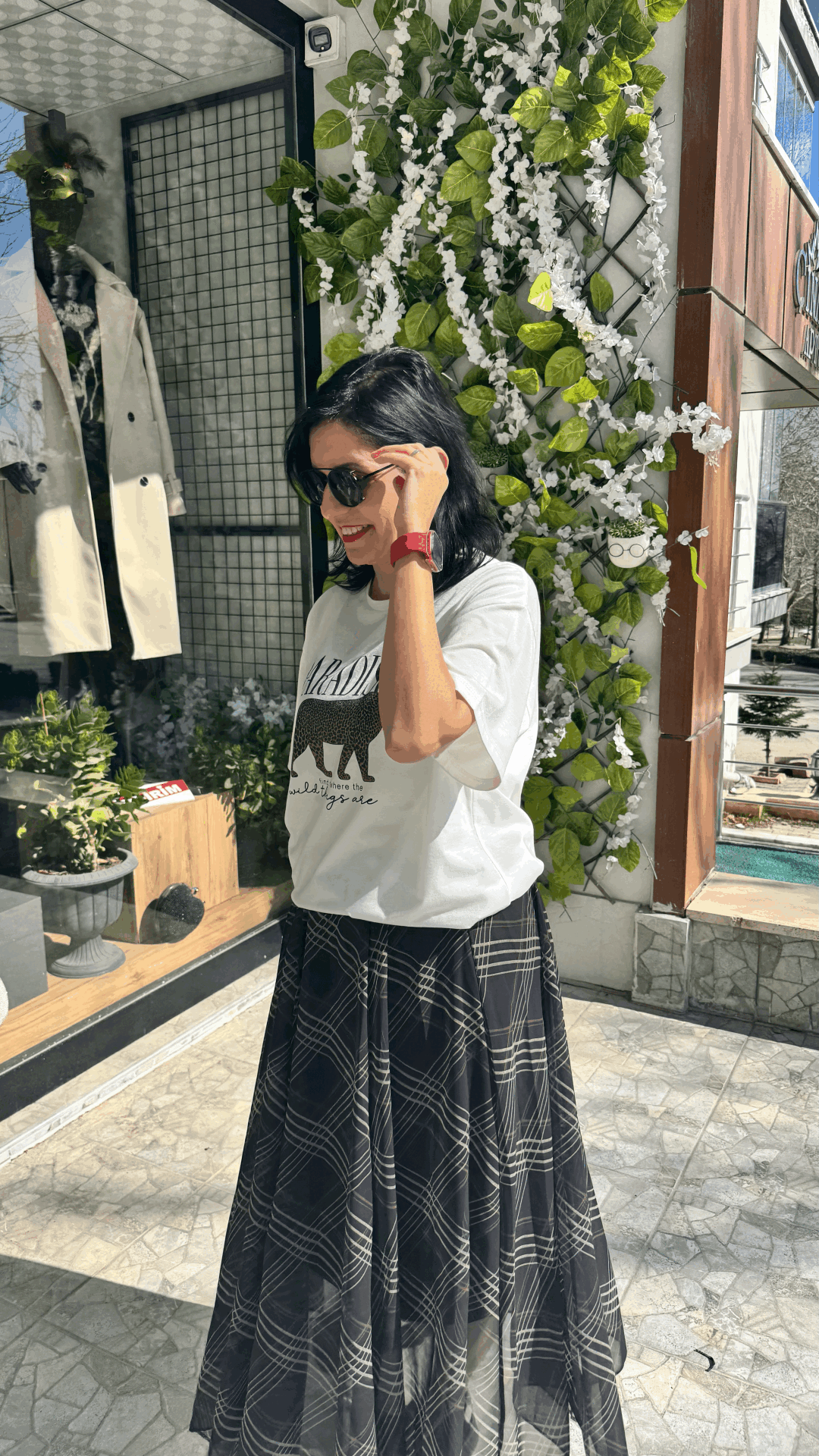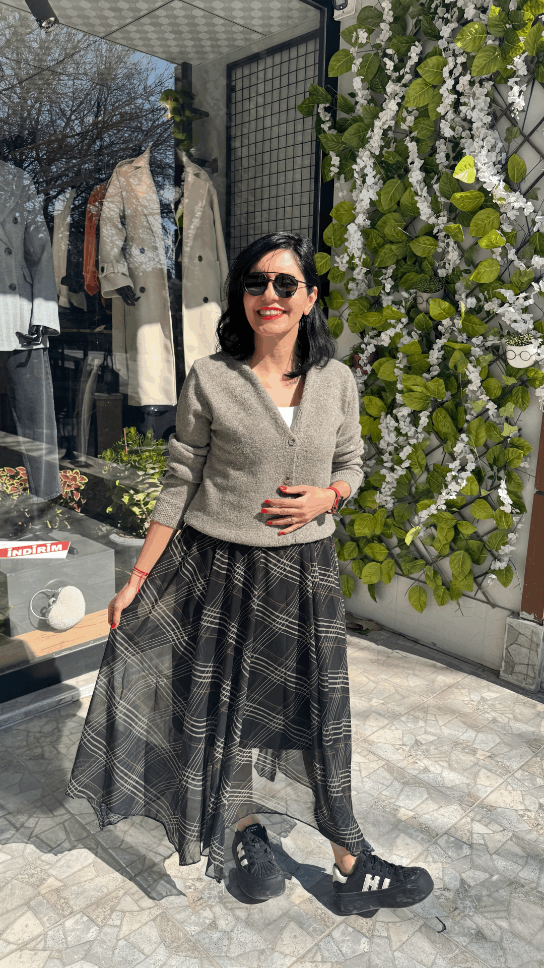 Kahve ve Bej Renkli Asimetrik Şifon Etek