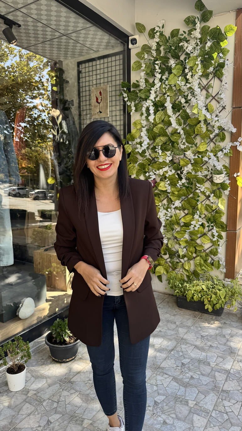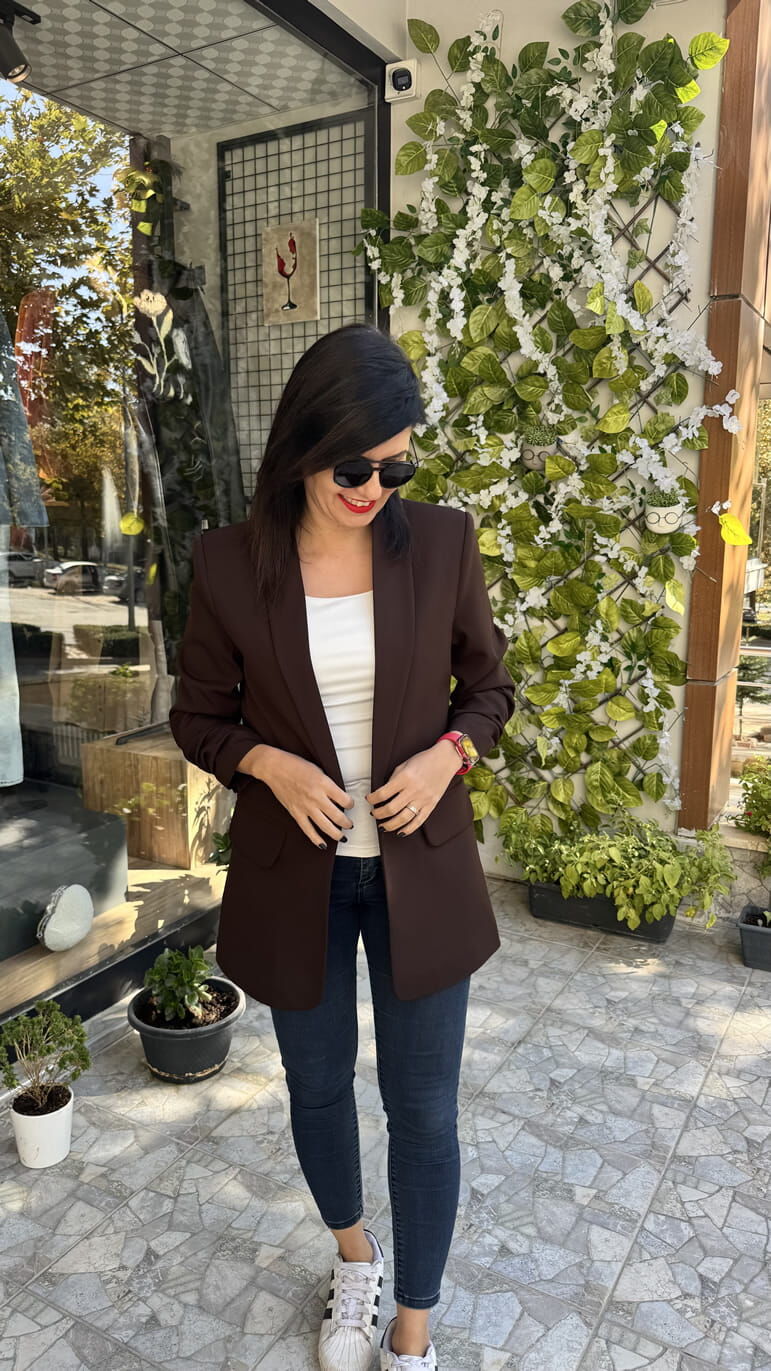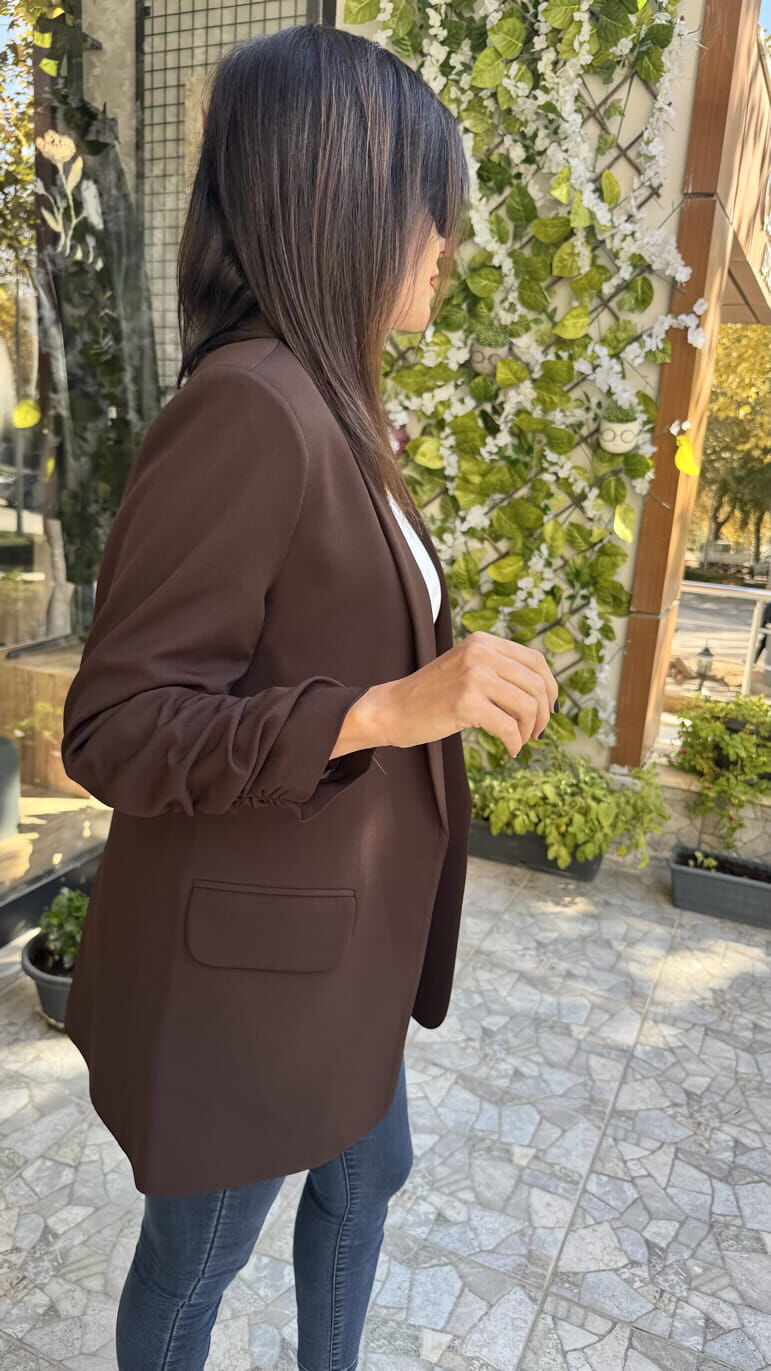 Kolu Büzgü Detaylı Atlas Kumaş Kahverengi Blazer Ceket