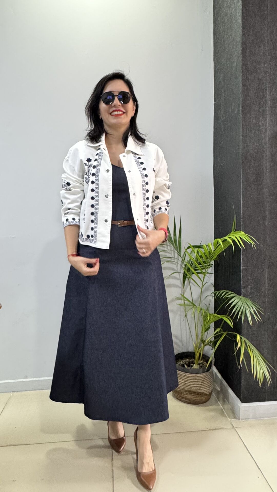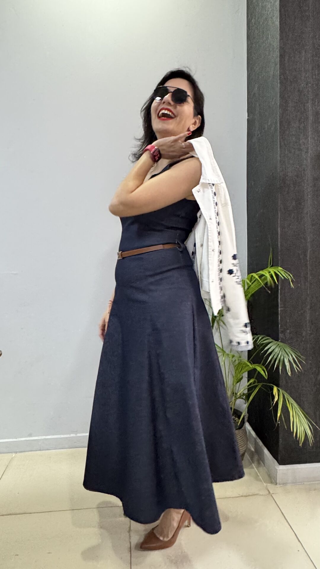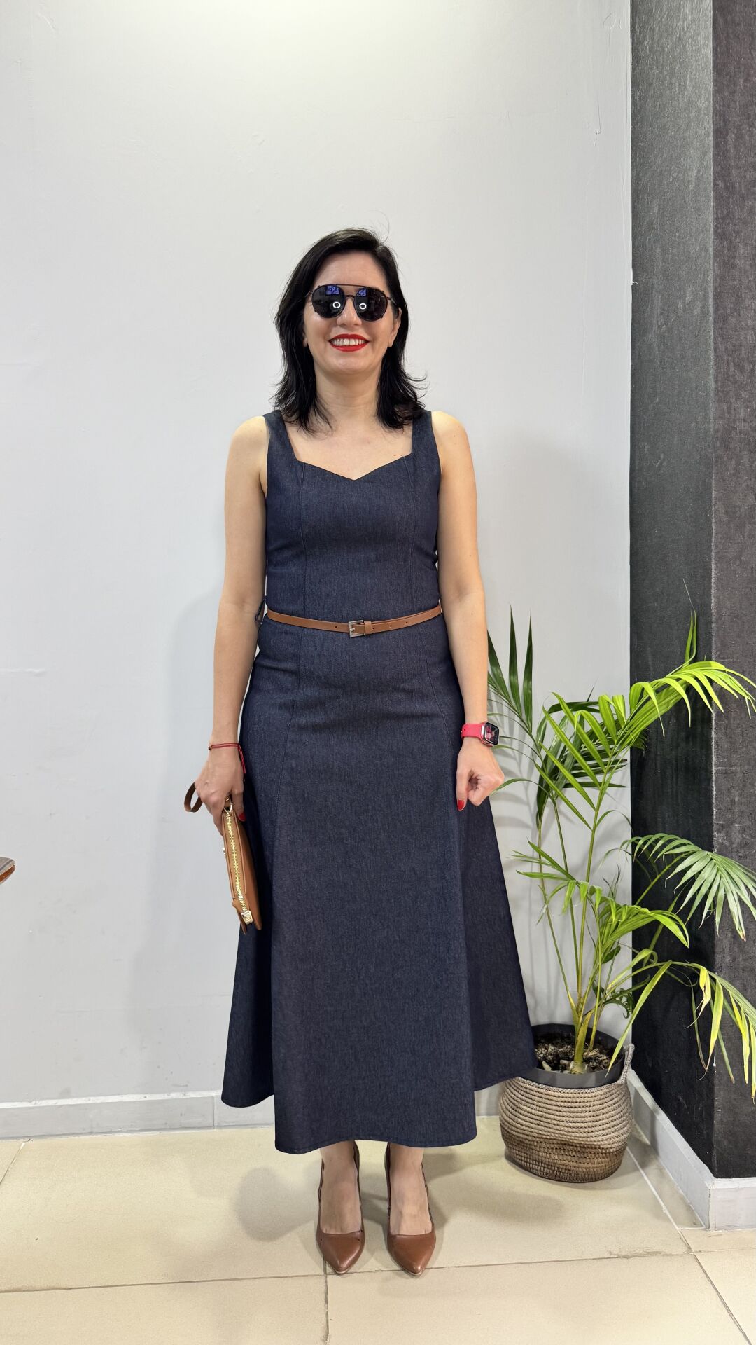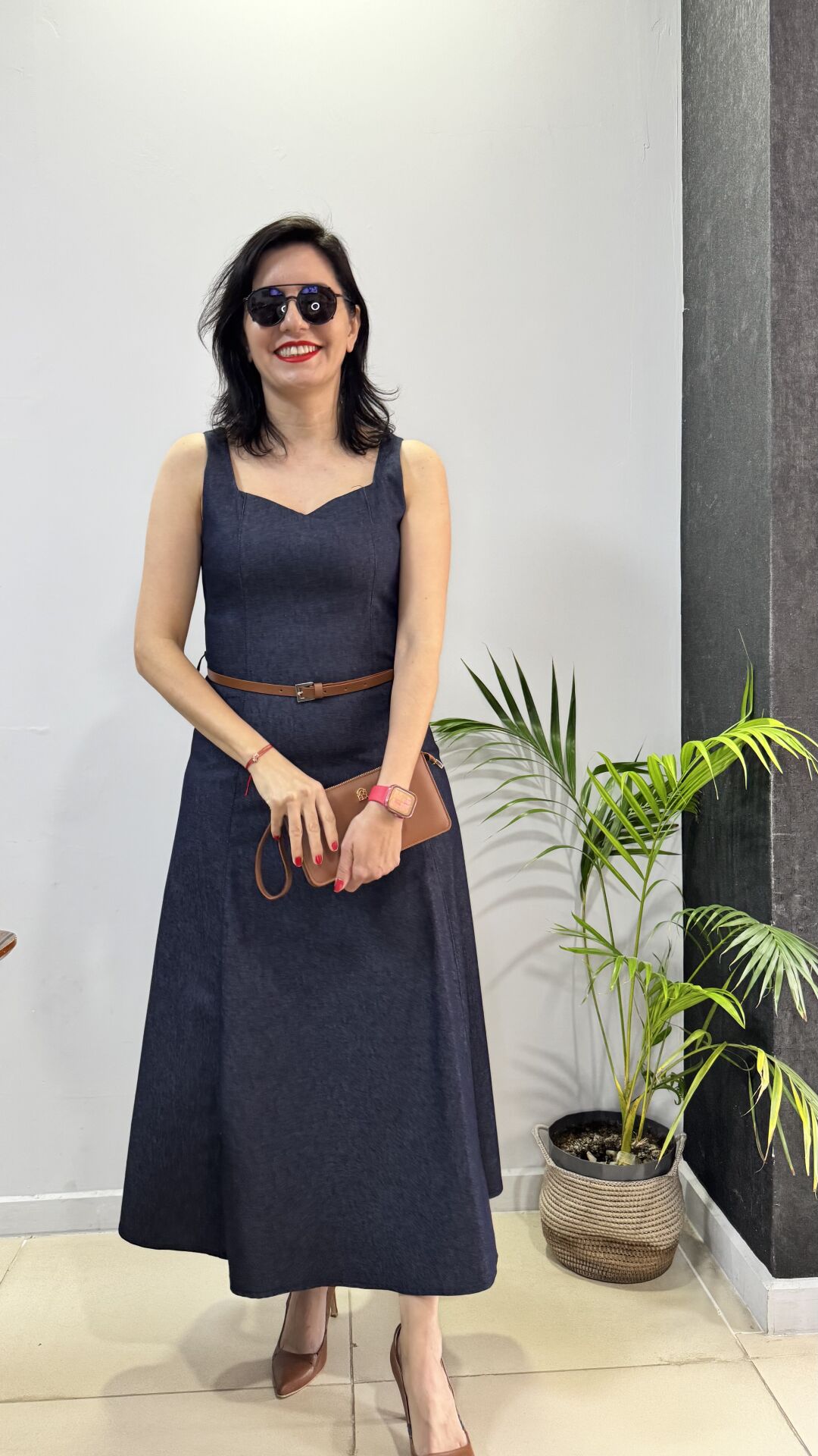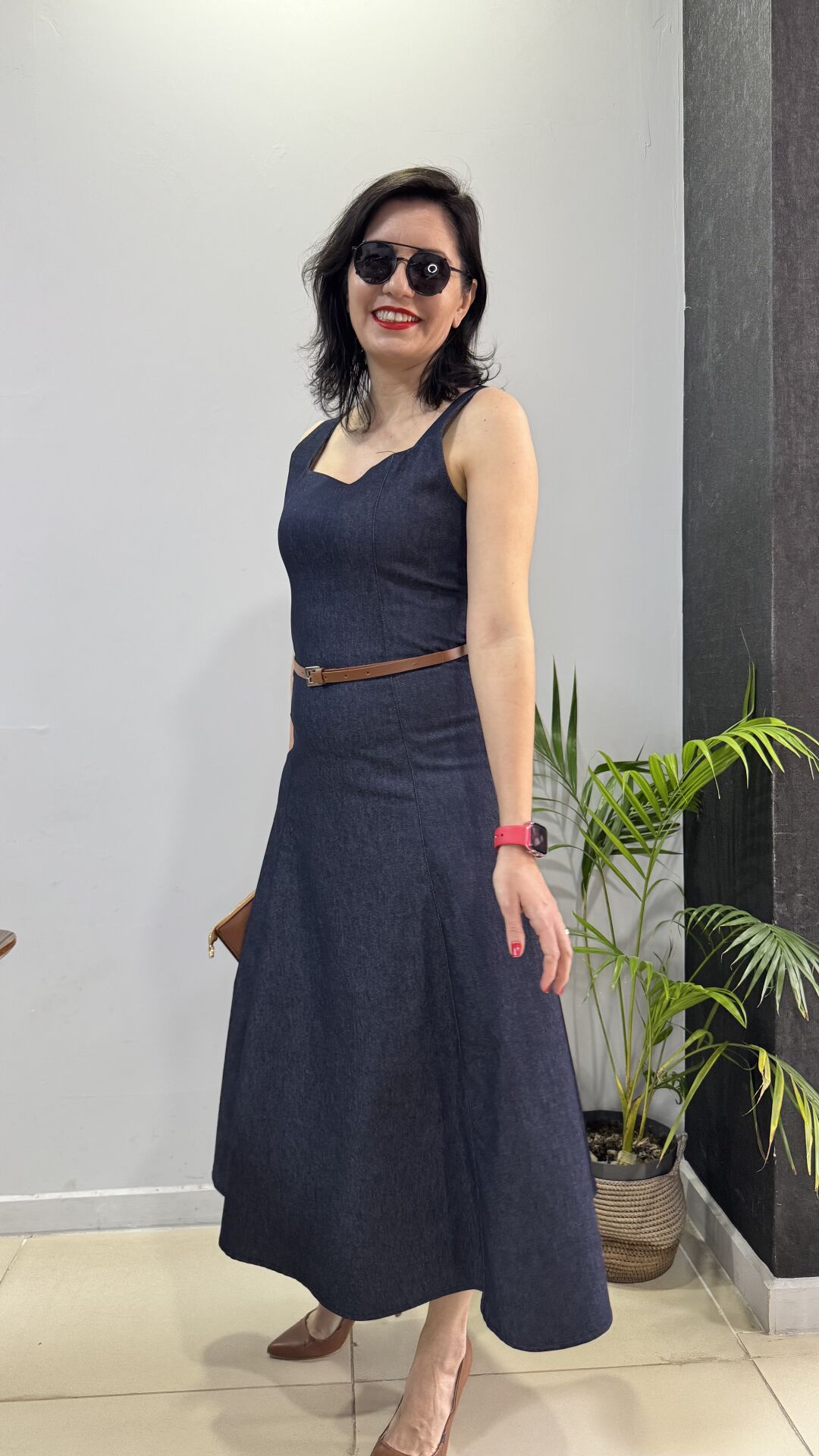 Mavi Uzun Kot Elbise Kalın Askılı Kare Yaka