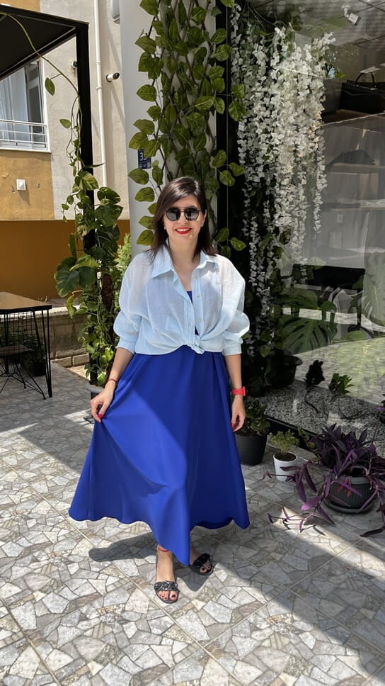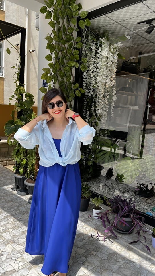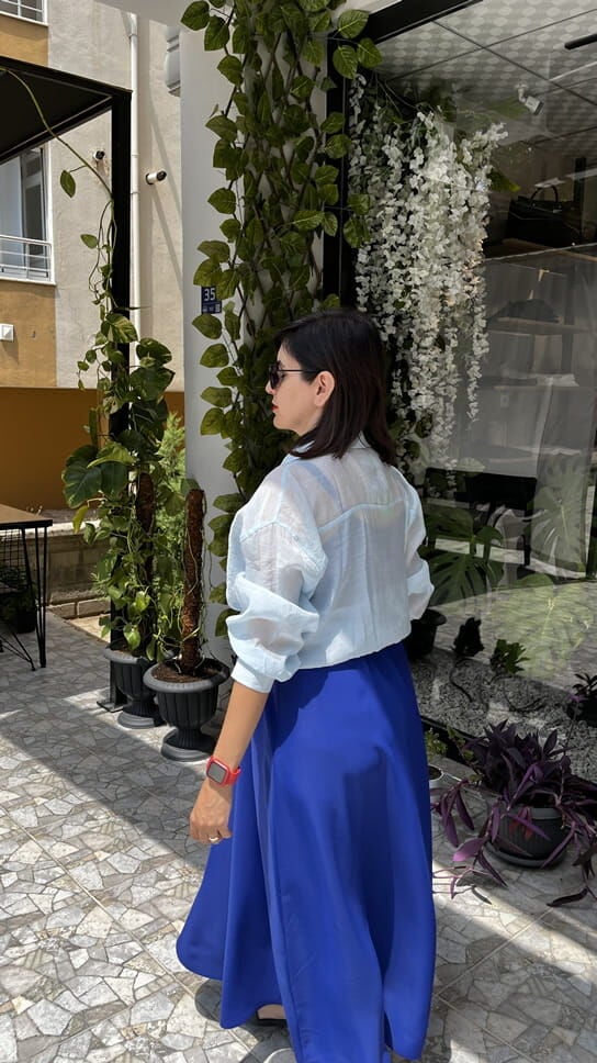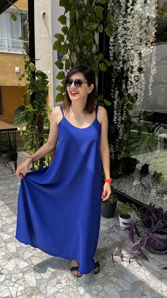 Saks Mavisi İnce Askılı Uzun Dubai Kumaş Elbise